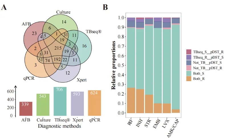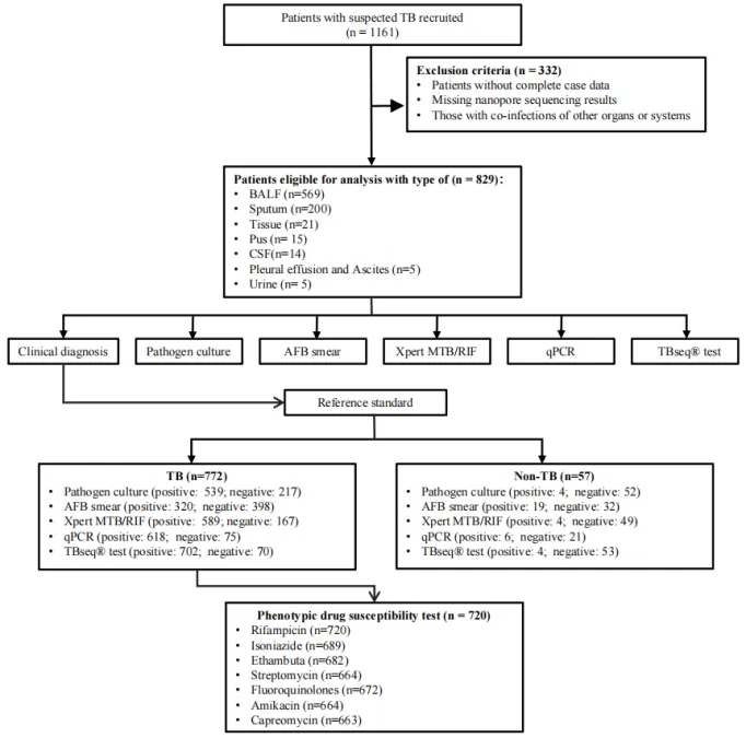 本研究招募了來自6家結核病定點醫院的1161例疑似結核病患者,經篩選后納入829例進行后續分析。通過對比M.tb培養、AFB涂片、Xpert MTB/RIF Ultra、qPCR及TBseq®五種診斷方法的性能,以臨床診斷為金標準,評估其診斷準確性。同時,對720例結核患者進行pDST,驗證TBseq®在耐藥性預測中的表現 (Figure 1)。